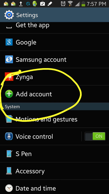 Go to Settings > Add Account. (see picture below)